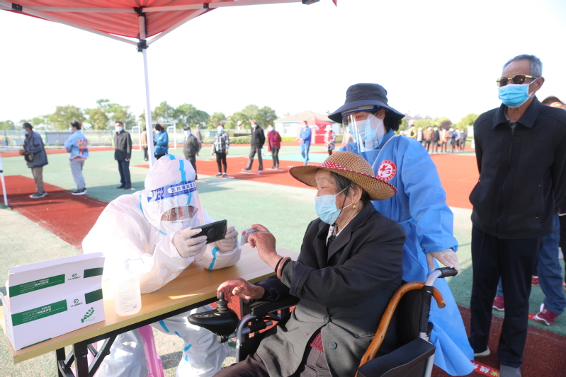 “請從這邊走!”轉業軍人、青年黨員孫強,標準軍人站姿導引著檢測居民有序進入,成為檢測中的一道風景。青年黨員趙珊、沈燕是一對好姐妹,由于連續的叫喊讓沈燕的嗓子嘶啞,今天她倆特意交換的分工。“這隊人少,請到這隊來!”接過好姐妹手中的大喇叭,趙珊大聲招呼著,將進入檢測區的居民有序分流到3個采樣區。“你們在這里等我會兒,我先幫你們登記。”換成維護秩序后,沈燕時刻關注著檢測的人群。70多歲的王奶奶家住劉圩小區,獨自一個坐著電動輪椅來到劉圩居委會核酸采樣點。沈燕見狀立刻上前引導她來到綠色通道,熱情地幫助她登記信息。不到5分鐘,王奶奶就完成了采樣。沈燕又小心地把她帶到了檢測出口。細心的黨員孫偉,在檢測中發現有不少行動不便的老人。今天他提前借來了一輛輪椅,看到年老體邁的老人,他就主動迎上去,把老人推進檢測綠色通道,從掃碼測溫到登記采樣,再到出口離開,最后把老人安全地交到老人家人手中。