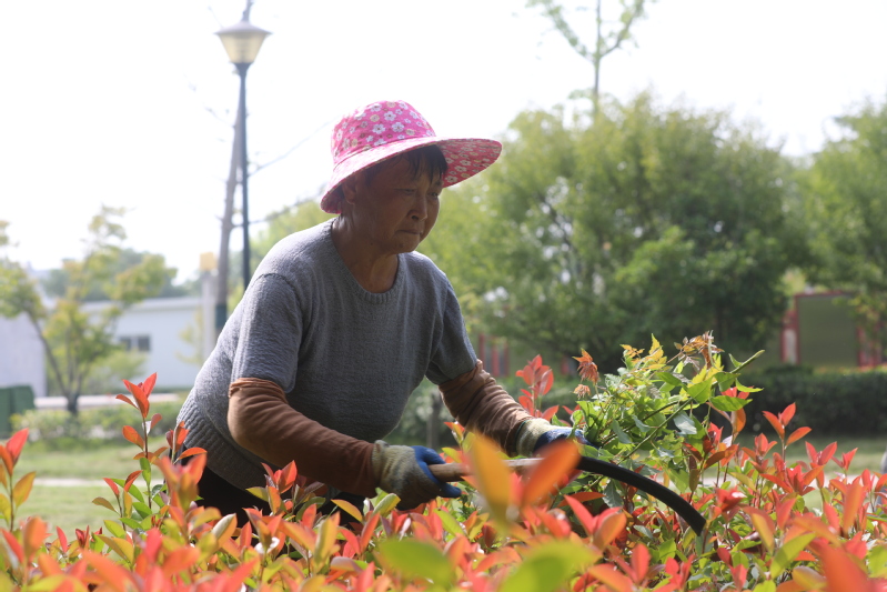 7月27日,寶應(yīng)湖農(nóng)場(chǎng)職工文化公園,7名工人正在為公園綠化除草。越是高溫雜草長(zhǎng)得越旺。以席正英為隊(duì)長(zhǎng)的綠化員們分工合作。草坪上用電動(dòng)切草機(jī)清理,隨著“隆隆”的機(jī)聲,切碎的草屑在刀頭間飛濺,濺到了工人的身上、飛上了工人的臉龐,刺癢刺癢,淡淡的青草味洋溢在夏日的晨光里。綠化帶里,爬騰類的雜草枝枝蔓蔓,覆蓋的綠化樹上,工人們就用手先拉斷經(jīng)脈,再扯掉枝葉;低矮類的雜草擁擠在綠化樹間,工人們蹲下身子就用手拔、用刀割。當(dāng)天7名工人清理綠化300多平方米。