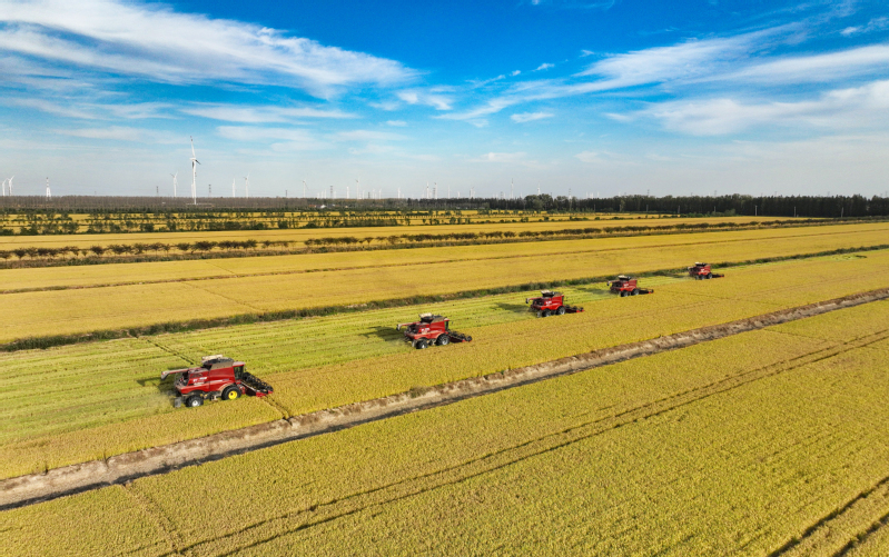 2023年10月28日,在蘇墾農發新洋分公司新南生產區19大隊的高標準農田上,五臺凱斯7088大型聯合收割機穿梭在稻田中搶收水稻。蘇墾農發新洋分公司搶抓晴好天氣,發揮農墾企業機械化優勢,確保秋糧顆粒歸倉。