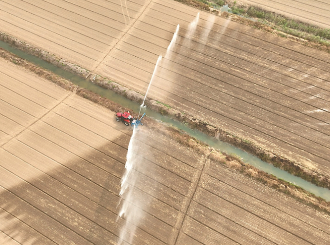近日,在射陽縣淮海農(nóng)場四分場剛播種的玉米大豆帶狀復(fù)合種植農(nóng)田內(nèi),噴灌機(jī)正在田間進(jìn)行抗旱作業(yè)。 陸軍 攝 (視覺江蘇供圖)