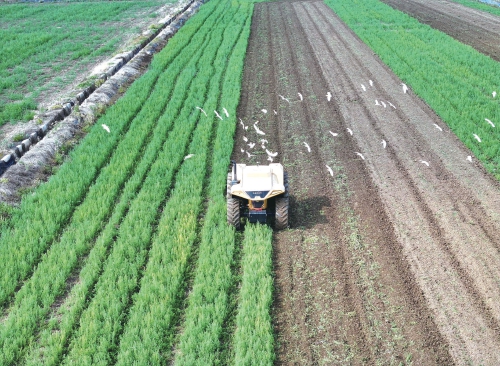 小滿時節,位于江蘇省淮安市金湖縣的江蘇農墾寶應湖農場歐盟國標雙認證的有機稻種植基地,一臺無人智能拖拉機正在進行旋耕作業。這臺無人智能拖拉機由丘沃智能科技自主研發,實現效率與油耗的聯合優化控制。通過AI作業規劃算法,農機和農具可自主協同形成覆蓋作業方案,實現24小時無人化精準作業,單日耕作面積達700畝,較傳統模式效率提升3倍。 梁德兵 攝(來源:大國三農)