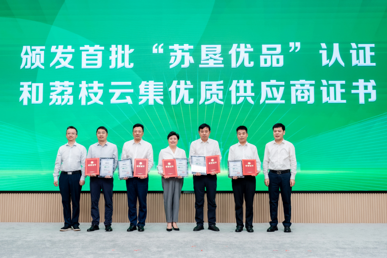 現場還舉行了“蘇墾優品”認證證書及“荔枝云集優質供應商”證書頒發儀式。江蘇省農墾米業集團有限公司、蘇州蘇墾現代農業發展有限公司、金太陽糧油股份有限公司、江蘇農墾漁業科技有限公司、江蘇農墾乳業科技有限公司五家企業獲得首批授權。