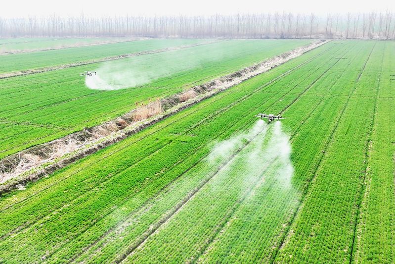 在省農墾三河農場邱上營分場的麥田里,植保無人機進行飛防作業。顏懷峰 錢厚紅 攝