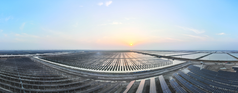 江蘇農墾聚焦生態環保,著力發展綠色循環經濟,全面推動產業綠色化轉型。圖為2024年5月興建的東辛漁光一體集中式光伏發電項目,目前已順利并網發電。