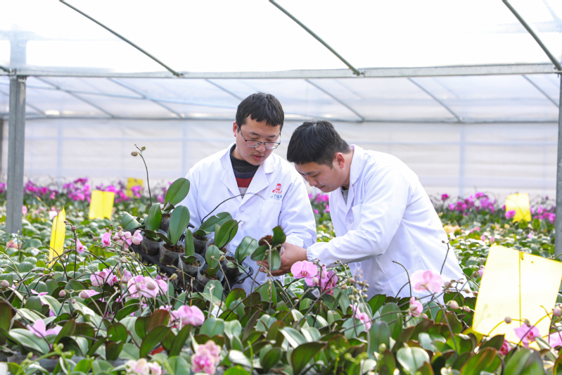 在云臺農場興墾科技溫室蝴蝶蘭育苗基地,工作人員正在對區域內蝴蝶蘭植株進行管護。作為高端觀賞花卉,蝴蝶蘭觀賞性強,市場價格較高,云臺農場結合花卉培育,發展休閑觀光、研學體驗等項目吸引游客,為農場帶來顯著的經濟收益。此外,蝴蝶蘭培育需要精準的溫控、光照、組培技術等,云臺農場興墾科技依托現代農業科技,培育特色花卉,打造自有品牌,增強市場競爭力。目前,該基地現有大小苗蝴蝶蘭18萬株,品種包含紅蝴蝶、安娜、滿天紅等200多個品種。下一步,將把總株數擴大至60萬株,并于3月底完成蝴蝶蘭組培室搭建工作,為蝴蝶蘭組培苗技術研發和產業化生產銷售提供堅實基礎。
