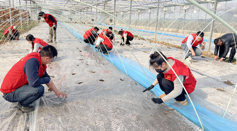 近日,寶應湖農場社區機關黨總支組織20余名黨員、積極分子深入農場高效農業示范園,開展“旗幟領航志愿紅 攜手助力產業興”主題實踐活動,為新種植的13個大棚毛豆破膜出苗提供人工輔助。
