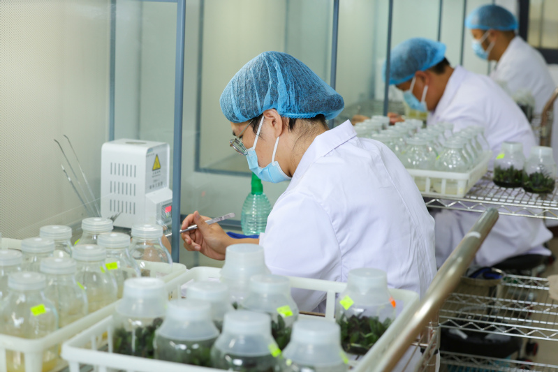云臺農(nóng)場攻克了蝴蝶蘭花苗培育中的技術(shù)瓶頸,運用科技手段實現(xiàn)了蝴蝶蘭花苗的智能化流水線生產(chǎn)。圖為技術(shù)人員正“全副武裝”在潔凈的操作間里忙碌,精心制作培養(yǎng)基。