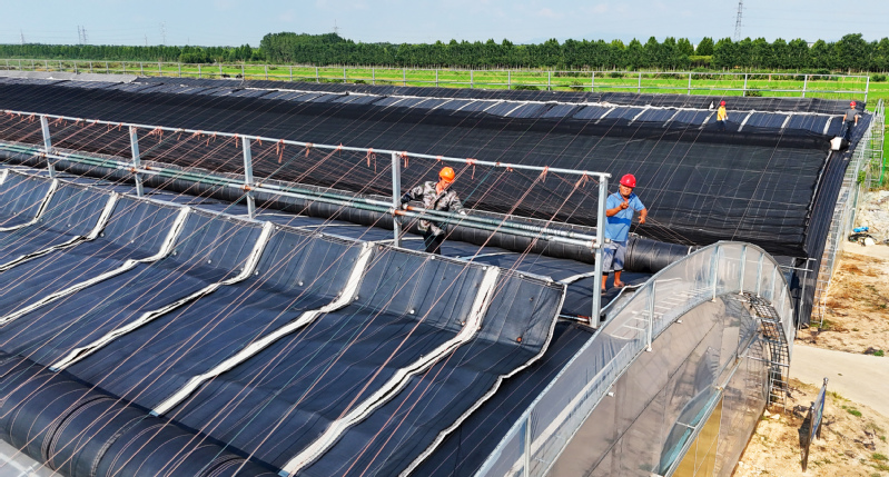 7月29日,連云港市海州區(qū)崗埠農(nóng)場,工作人員正在檢查、加固蔬菜大棚,防范臺風(fēng)“竹節(jié)草”。