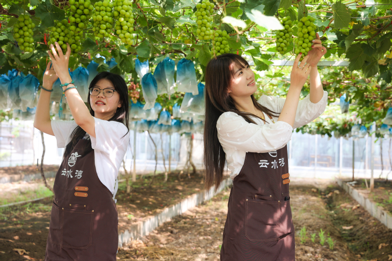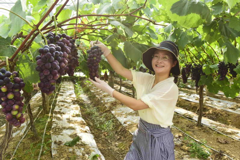 8月3日,在射陽(yáng)縣淮海農(nóng)場(chǎng)高效園區(qū)5畝連棟高架大棚葡萄園內(nèi),碩大成串的葡萄綴滿枝頭,就連空氣中也彌漫著沁人心脾、清新的水果味,經(jīng)過(guò)園區(qū)工人的精心培育,一串串綠色或黑色晶瑩的葡萄掛在藤架上,令人垂涎欲滴。入口品嘗,個(gè)個(gè)飽滿多汁,甜而不膩。慕名來(lái)采摘觀光的游客,在葡萄園內(nèi)一邊抬頭觀賞、一邊低頭采摘(如圖),幸福的滋味綻放在臉龐。在葡萄園里,剛剛用微信掃碼后的淮海居民吉長(zhǎng)明興奮地說(shuō):“我每年都要來(lái)到園區(qū)買幾箱葡萄,這里的葡萄不僅口感好,果也大,讓城里的人也來(lái)嘗嘗我們農(nóng)場(chǎng)獨(dú)特的‘土特產(chǎn)’。”據(jù)他講,每年城里的親朋好友每到這個(gè)季節(jié),就要托他買幾箱葡萄帶到城里去。據(jù)了解,園內(nèi)種植品種“夏黑”和“陽(yáng)光玫瑰”等葡萄品種,畝產(chǎn)量可達(dá)4000斤上下。特別是其統(tǒng)一施用農(nóng)家肥、無(wú)公害防蟲防病、反光膜覆蓋、科學(xué)滴灌、疏果等措施,輔助于智能化的通風(fēng)調(diào)溫、噴淋調(diào)水和調(diào)節(jié)光照設(shè)施的開展,合理調(diào)節(jié)土壤水分,降低田間溫、濕度,也減輕各類病蟲害的侵襲,讓葡萄按規(guī)定設(shè)計(jì)的要求進(jìn)行掛果,確保種出安全、優(yōu)質(zhì)的葡萄提供給消費(fèi)者。“我們的葡萄每斤售價(jià)在8元/斤,一畝地毛收入可達(dá)20000元。”園區(qū)負(fù)責(zé)人解進(jìn)空說(shuō),“是良好的品質(zhì)和采摘