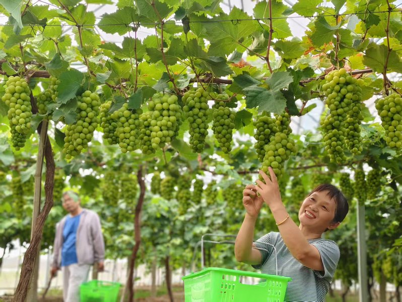 “海農葡萄”引八方葡友前來采摘、觀賞。圖為一位顧客雙手輕托飽滿青綠的葡萄串,仰頭注視,在綠葉與累累果實環繞間,盡顯田園采摘的愜意與對果實的欣賞。