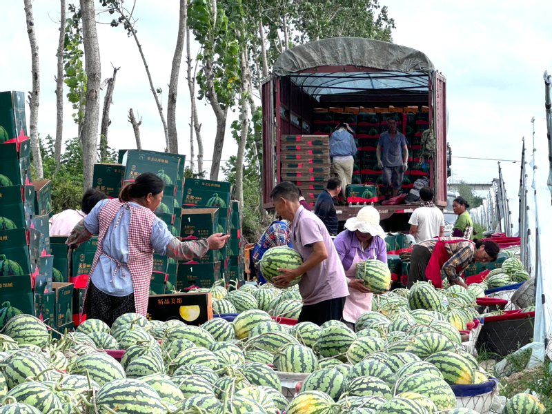 7月8日清晨6點,東壩頭農場的西瓜大棚已是一片繁忙。翠綠的瓜葉間,一個個飽滿圓潤的西瓜點綴其間,空氣中彌漫著清甜的果香。目前,每天有近20噸西瓜從這里出發,通過物流專線發往廣州、上海、杭州等城市的生鮮市場和大型商超。