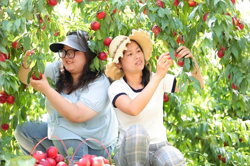 近日,云臺農場云水灣濕地公園近30畝桃樹進入成熟采摘期,色澤誘人、果香四溢,吸引眾多游客前來采摘、觀賞和客戶訂購。圖為游客置身云水灣桃園內采摘成熟的油桃,在濕地景觀環繞中體驗采摘樂趣。
